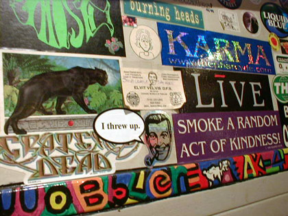 Stickered walls inside the highly recommended Grey Area coffee shop.