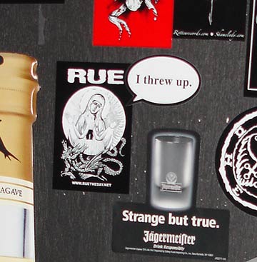 Detail of stickered door at Downtown Music.