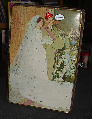 Stickered antique tin, which also features an