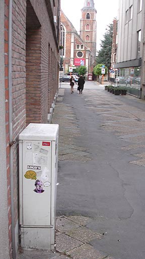 Another view of stickered power box on the streets of Kortrijk.