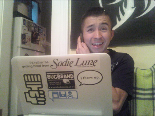 BASEK sports an "I threw up" sticker on his laptop.