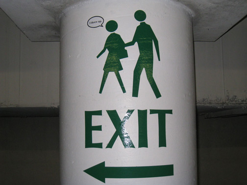 Stickered exit sign in Chinatown.