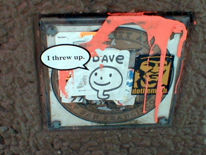 Stickered waste bin featuring the infamous Dave sticker. Dave is very prolific, and his stickers are all over SF. Go here to learn more about Dave.
