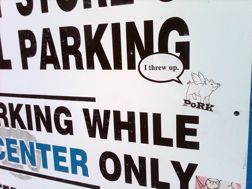 Stickered parking sign.