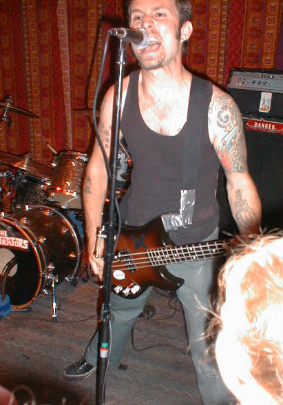 Mike Dirnt of GREEN DAY with "I threw up." sticker on his bass.