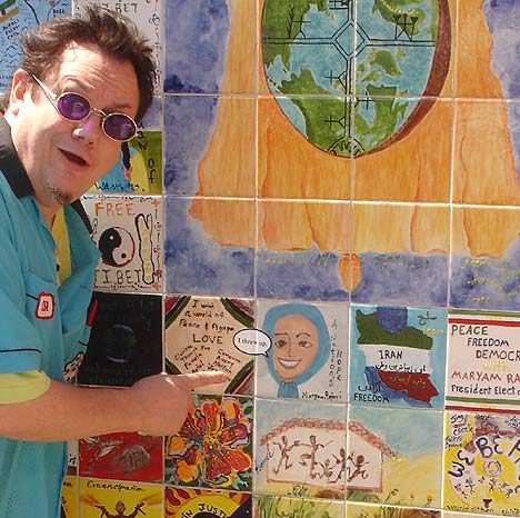 Artist KRK Ryden seems pleasantly surprised to find an "I threw up" sticker on this tile wall. Oakland, CA - May 2008 Photo by M. Pilmer