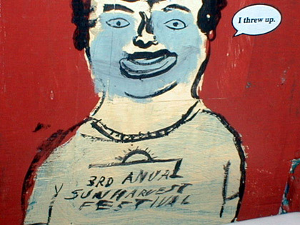 Photo taken in a men's restroom at unidentified bar. The entire restroom was decorated with odd paintings by this particular artist (anyone know his/her name?). Completely unsettling and beautiful.