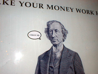Altered bus stop shelter advertisement.