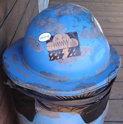 Stickered trash can.