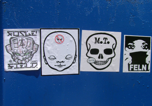 Stickered dumpster.