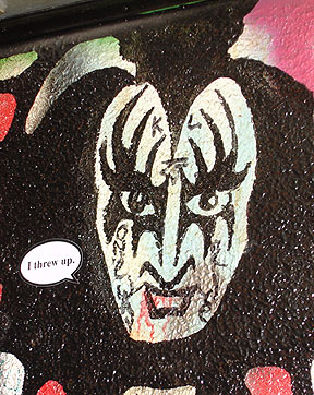 Detail of restroom graffiti at Relay Lounge, featuring an stickered Gene Simmons image.