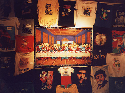 Wall of altered items at LUMP Gallery show. Included are various thrift store shirts and a Last Supper tapestry.