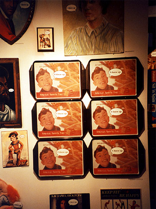 Wall of altered McDonald's fast-food serving trays with paper liners; as displayed at the LUMP Gallery show.
