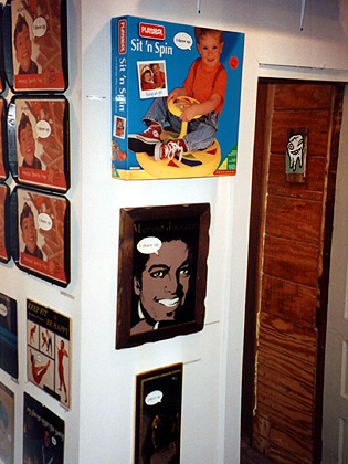 Various altered items as displayed at the LUMP Gallery show, including a "Sit 'n Spin" toy box, a Michael Jackson mirror, etc.