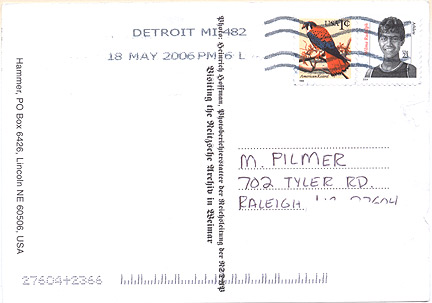 Altered postcard mailed to NC from MI.