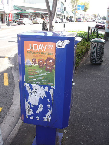 Another view of a stickered sticker on the streets of Hamilton.