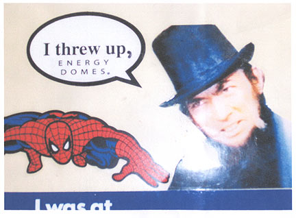 Combination of an "I threw up" sticker and part of the text from a DEVO Energy Dome sticker.