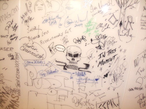 Stickered wall of autographs at SIRIUS XM Radio Studio.
