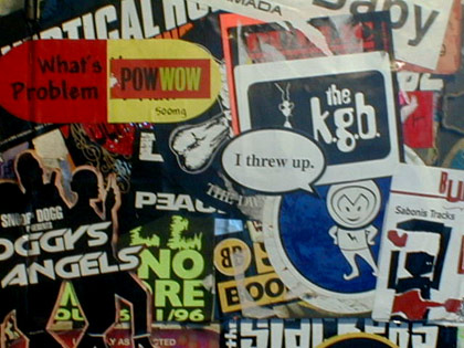 Stickered wall inside CD store on St. Marks in the East Village.