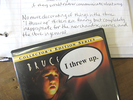 A video store in NC was having a problem. They kept finding "I threw up" stickers on their DVD cases.
