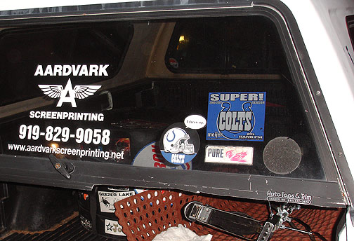 Greg Clayton's stickered pick up truck.