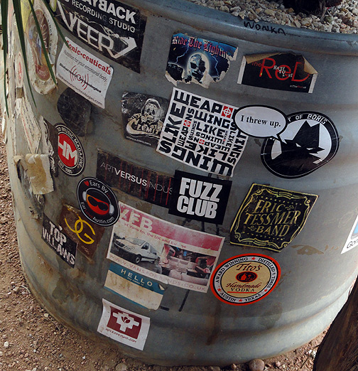 Stickered planter outside STUBB'S music venue/restaurant. Austin, Texas Sept. 18, 2012