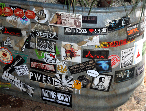 Stickered planter outside STUBB'S music venue/restaurant. Austin, Texas Sept. 18, 2012