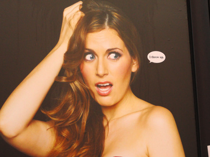 Close-up view of stickered telephone booth advert.