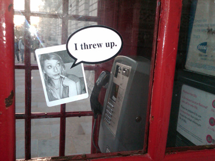 Close-up view of stickered phone booth.